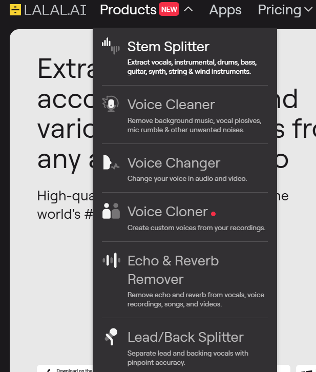 LALAL.AI is available online, so just go to LALAL.AI website and choose the product needed from Products’ section (or use a desktop/Android/iOS app);