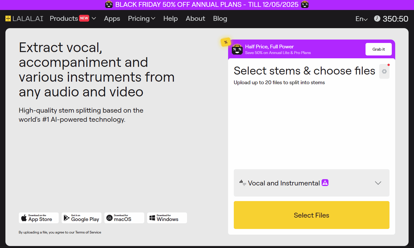 Visit the LALAL.AI website from November 21 to December 5, 2025, and click the Grab It button within the file upload widget. You will be taken to the Pricing section, where you can get the exclusive deal.