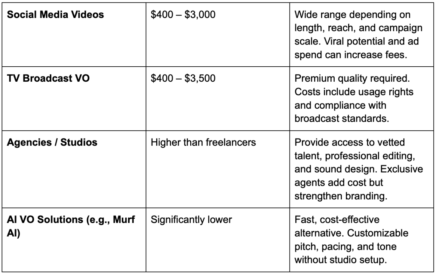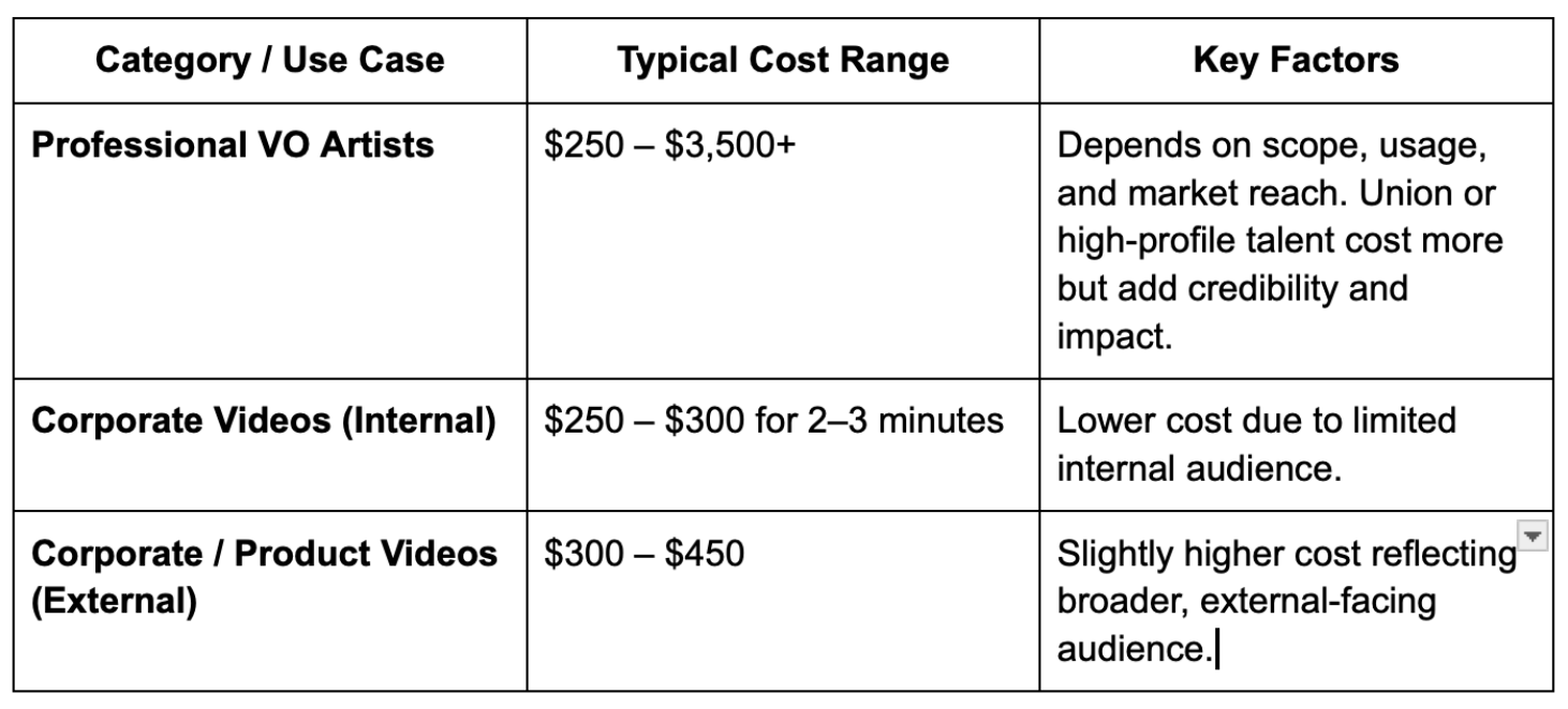 - Talent fees: professional voice actors charge per project, language, and usage rights. A single 60-second commercial VO can range anywhere from $300 to $1,000+ depending on the market;