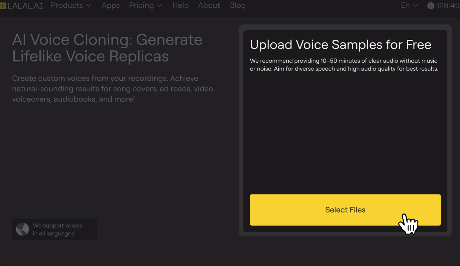 - Upload 10–50 minutes of clean voice samples without noise or music. Use different speaking styles for best results.