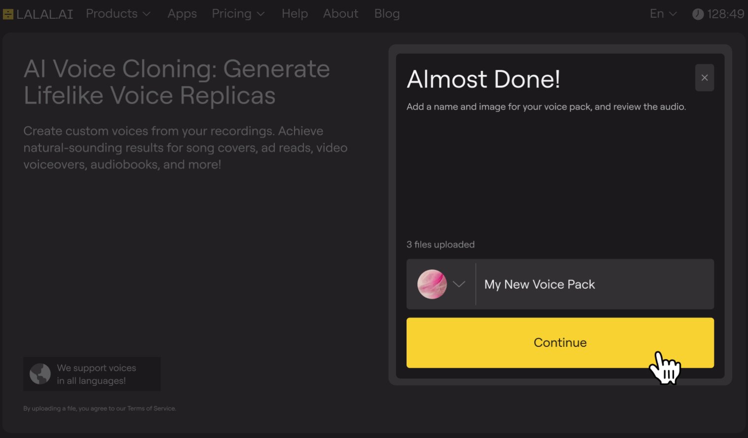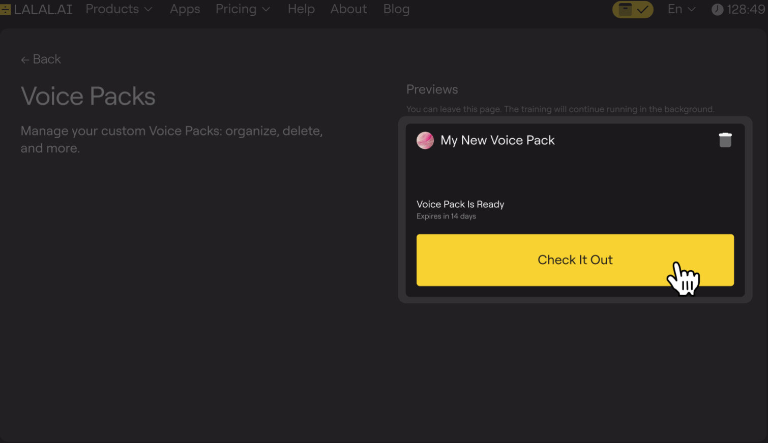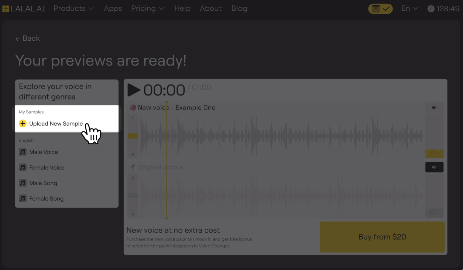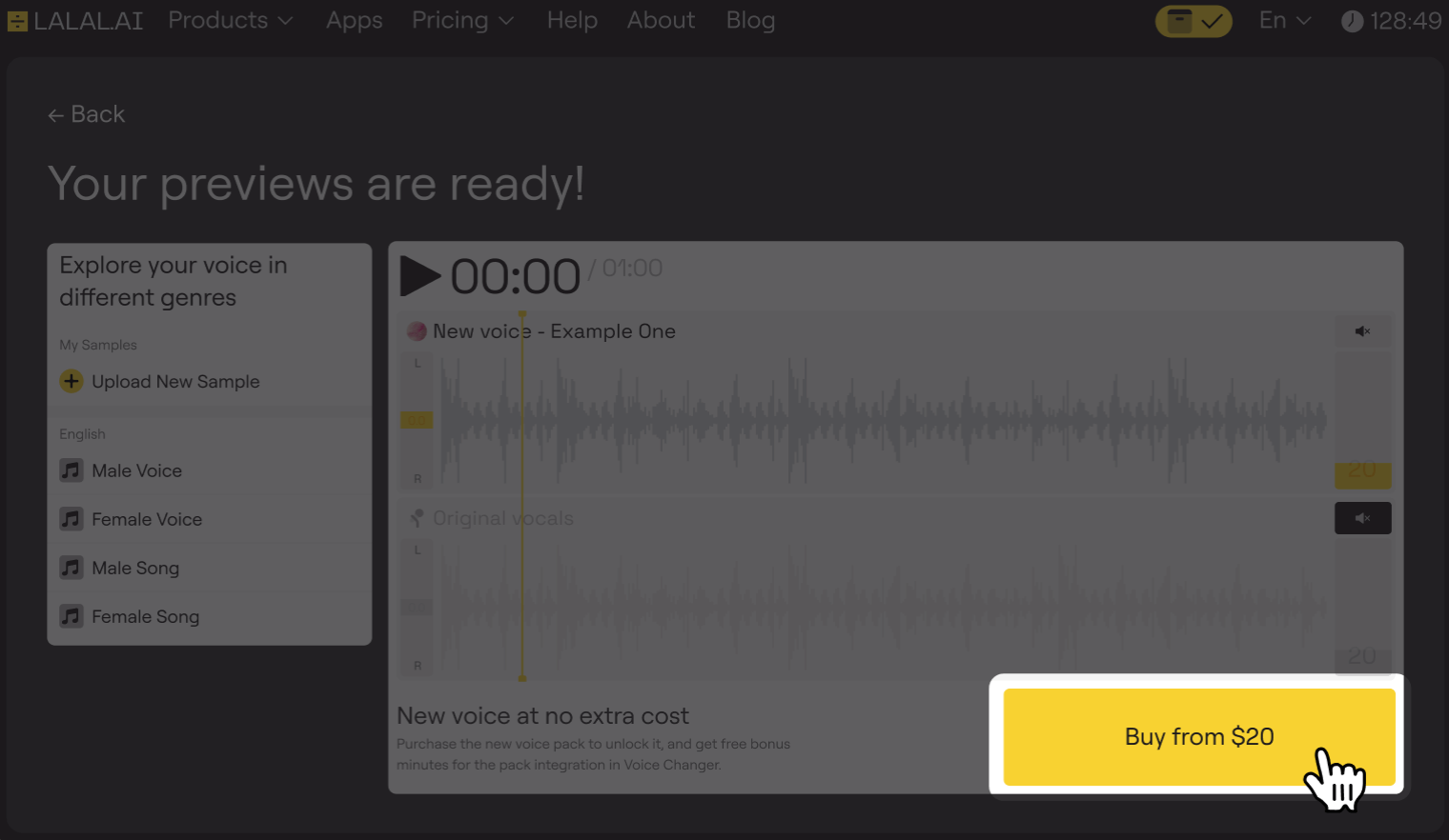- Purchase the clone to unlock full access if you like the preview. If not, create a new Voice Pack.