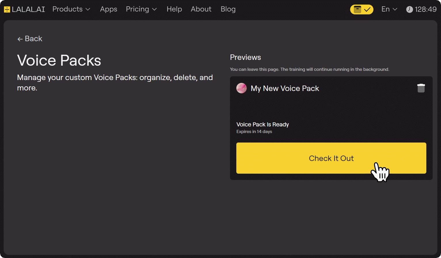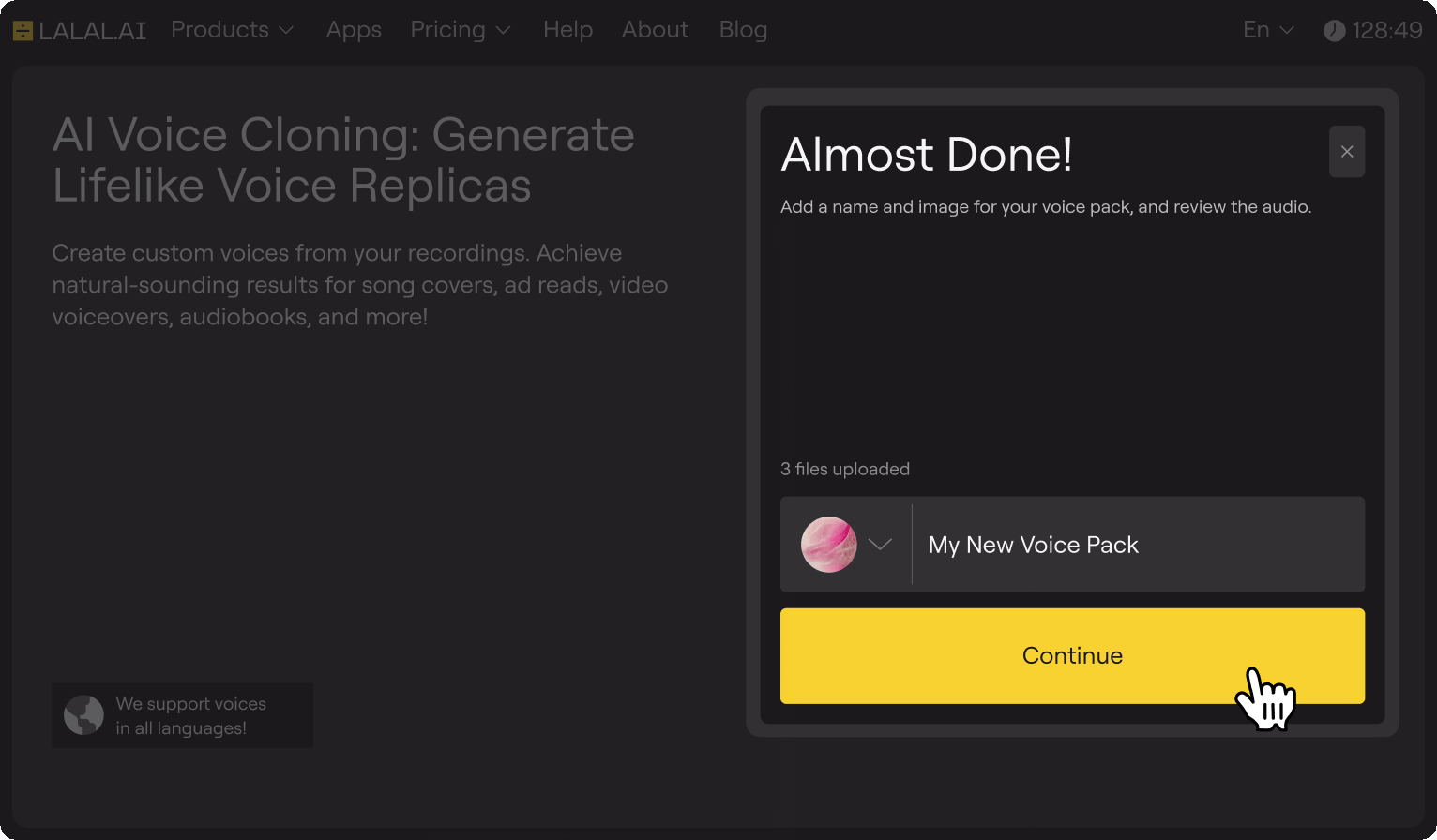 The platform will process your samples in the background, so you’re free to close the tab or work on something else while the AI builds your voice model.
