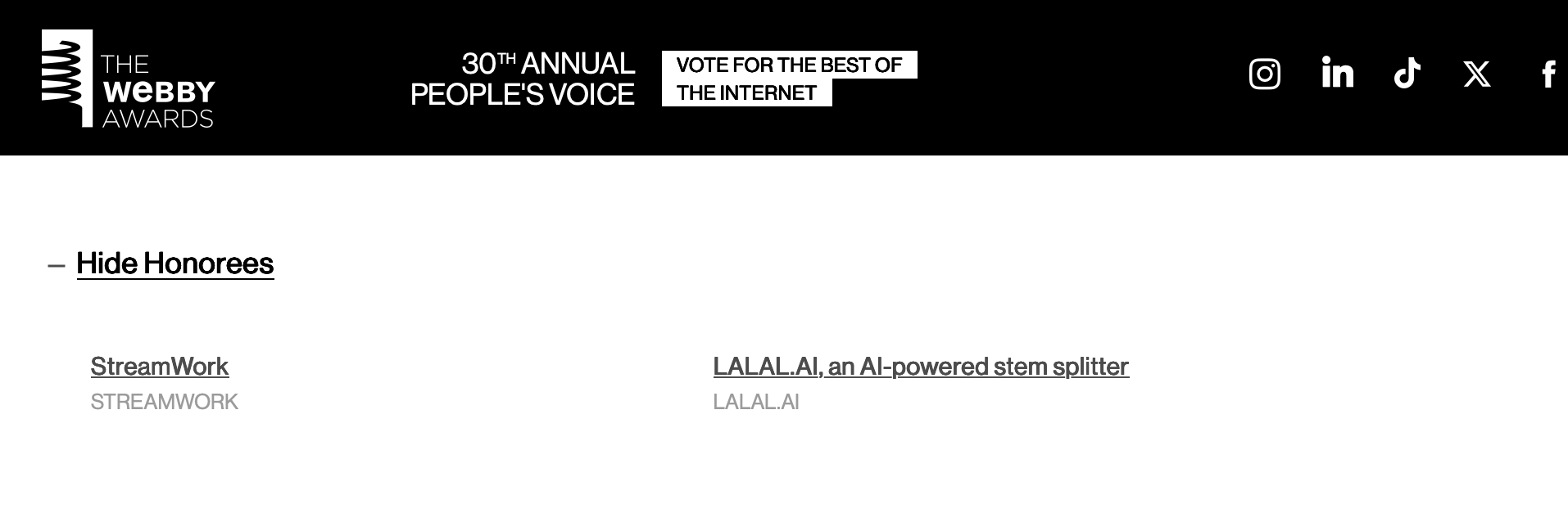 Being named a Nominee places LALAL.AI in the top 11% of all entries. The Honoree distinction recognizes the top 25%. Both in the same year. We're proud, and a little stunned!