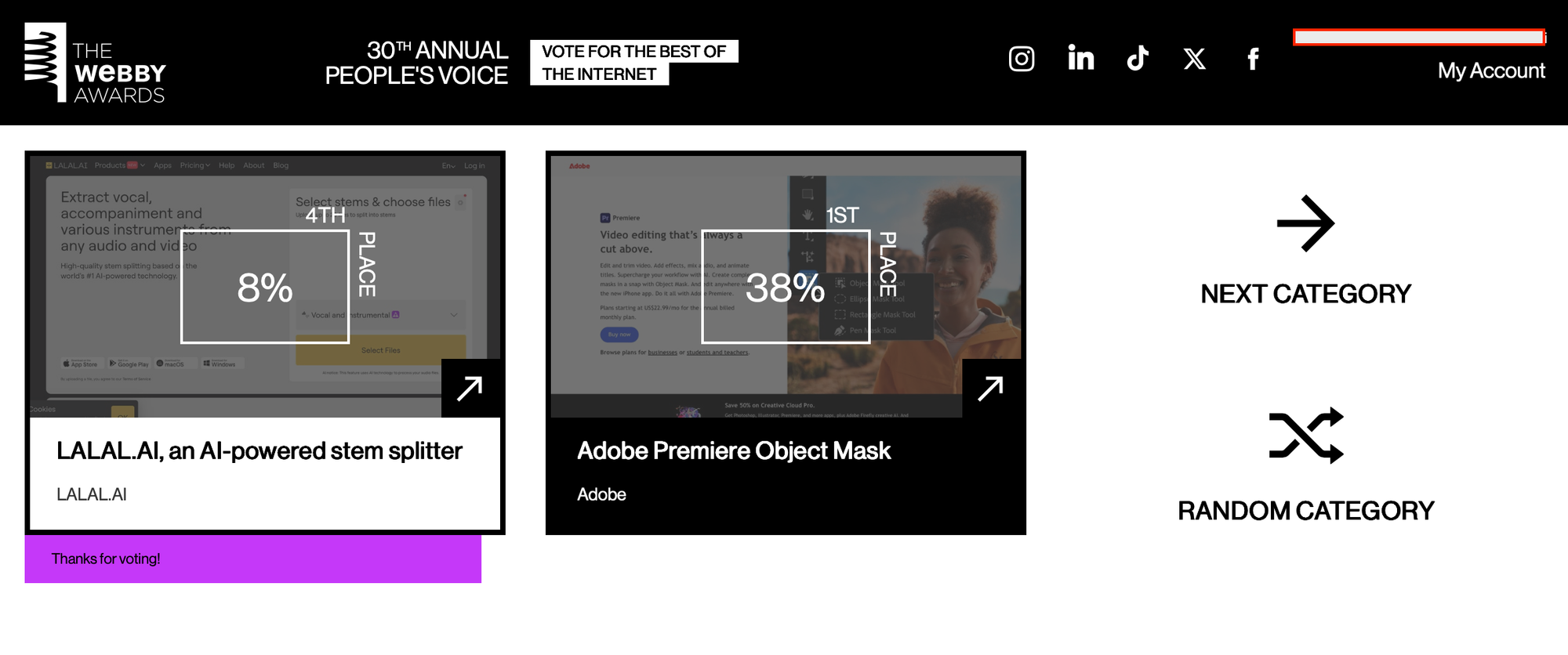 LALAL.AI is a Webby Award Nominee & Honoree 2026. Cast your free People's Voice vote before April 16th and help us bring home the win!