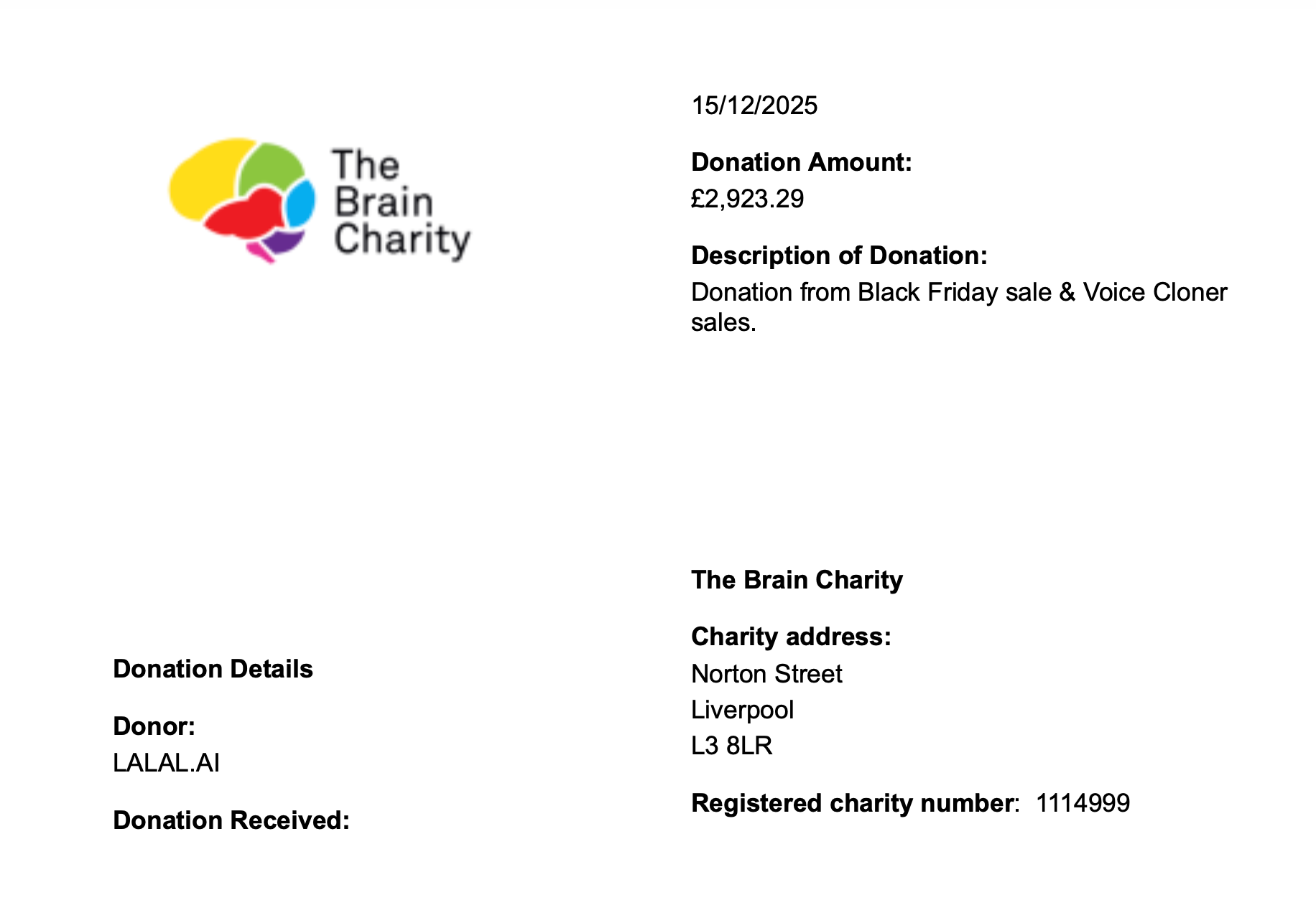 With support from the LALAL.AI community, a portion of Voice Cloner purchases was donated to The Brain Charity UK to support vital services.