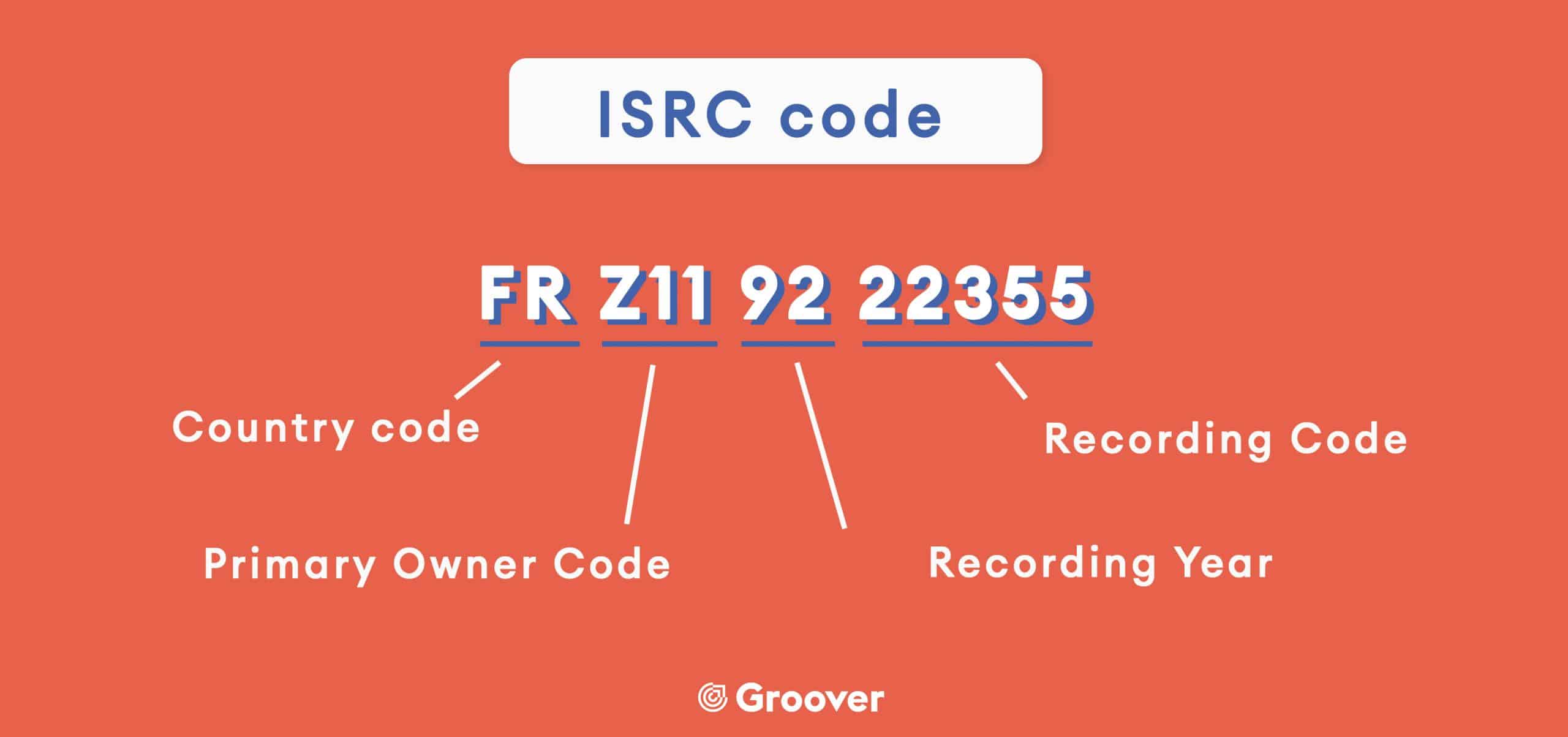 An ISRC code consists of 12 characters, divided into four elements: